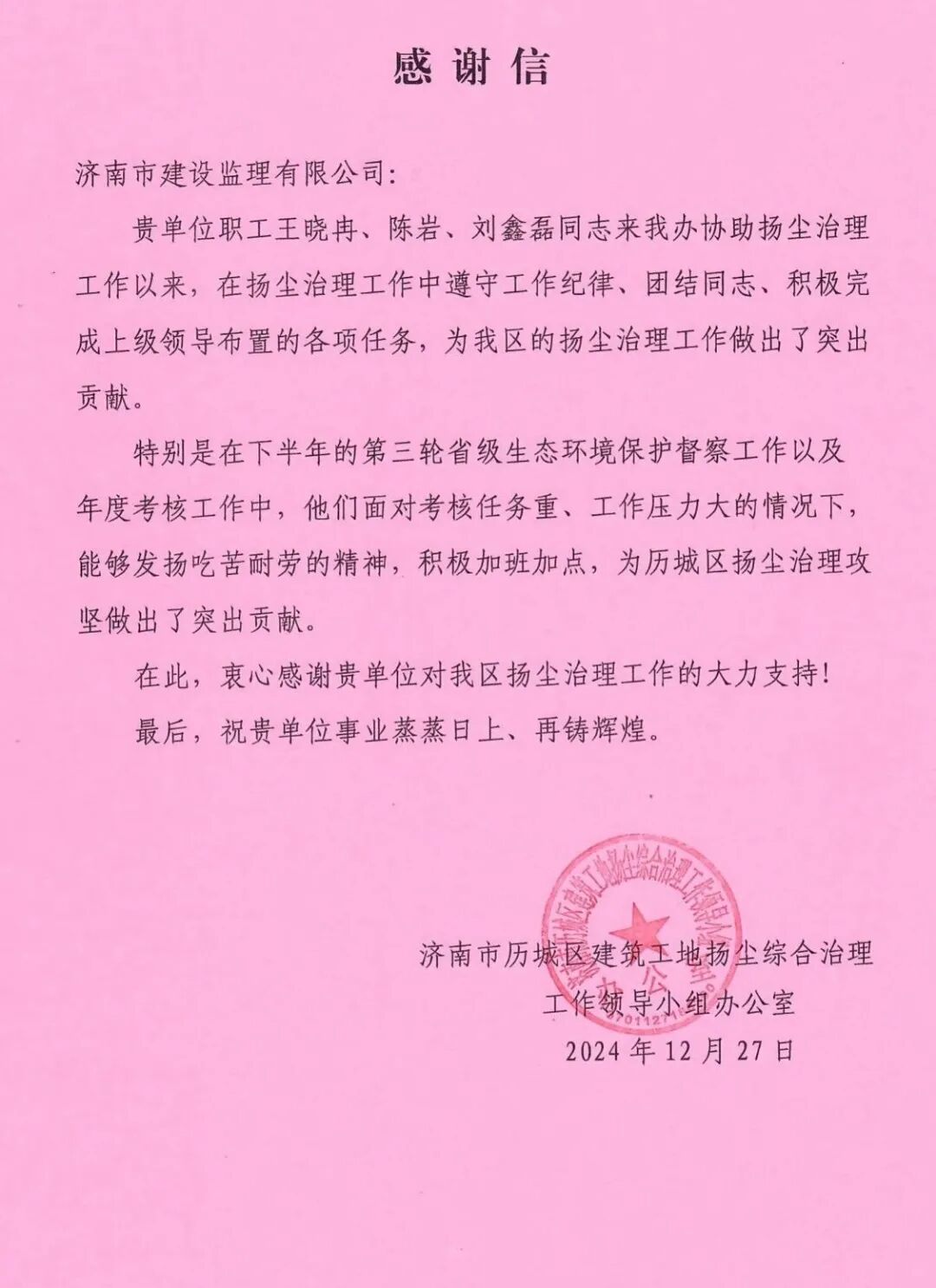 近日,我公司歷城區(qū)住建局第三方巡檢項(xiàng)目收到了來自歷城區(qū)建筑工地?fù)P塵綜合治理工作領(lǐng)導(dǎo)小組辦公室表揚(yáng)信,信中對(duì)我公司項(xiàng)目工作人員的業(yè)務(wù)水平、責(zé)任心、組織協(xié)調(diào)能力給予充分肯定。