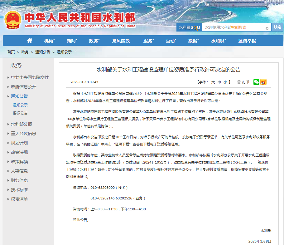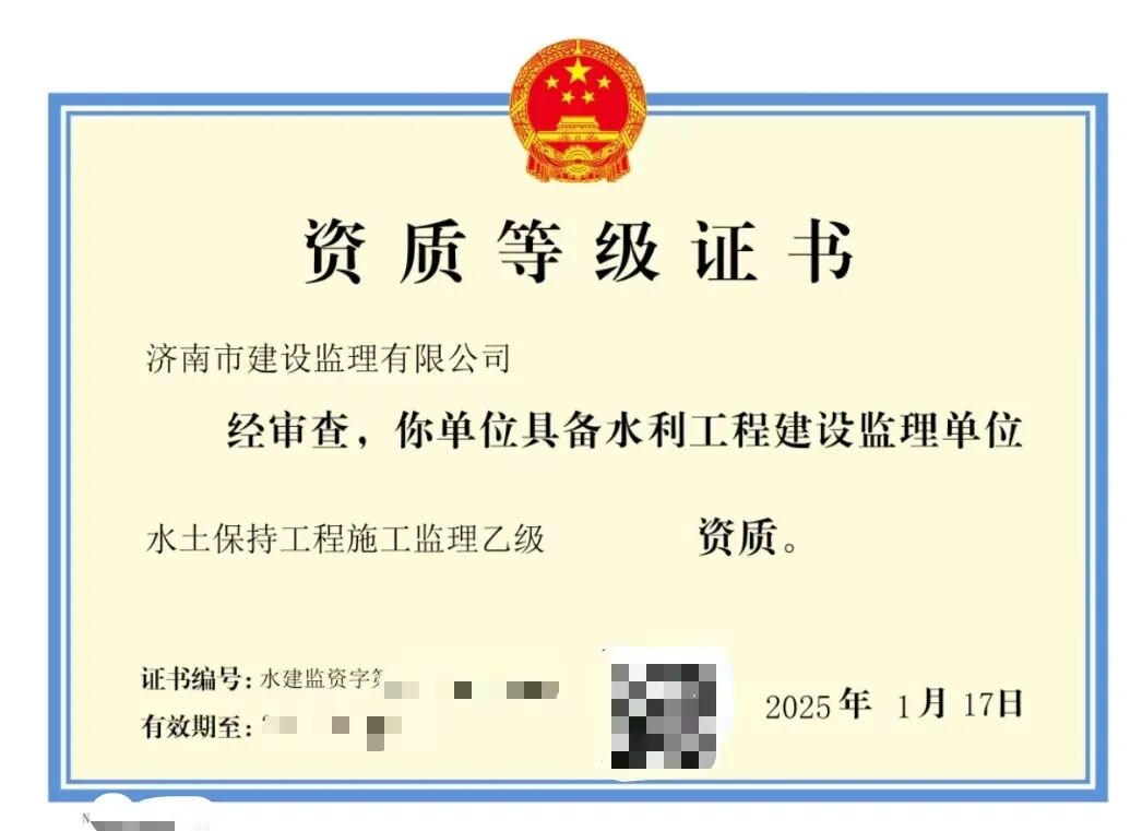 二〇二五年一月,經(jīng)水利部批準(zhǔn),我公司同時(shí)取得水利工程施工監(jiān)理乙級(jí)資質(zhì)及水土保持工程施工監(jiān)理乙級(jí)資質(zhì)。這是我公司在取得工程監(jiān)理綜合資質(zhì)后,又獲得的住建部管理范疇之外的從業(yè)資格,為公司經(jīng)營(yíng)業(yè)務(wù)開(kāi)辟新的領(lǐng)域,為公司業(yè)務(wù)類型的拓展提供新的平臺(tái),也為公司持續(xù)、快速發(fā)展奠定了堅(jiān)實(shí)基礎(chǔ)。
